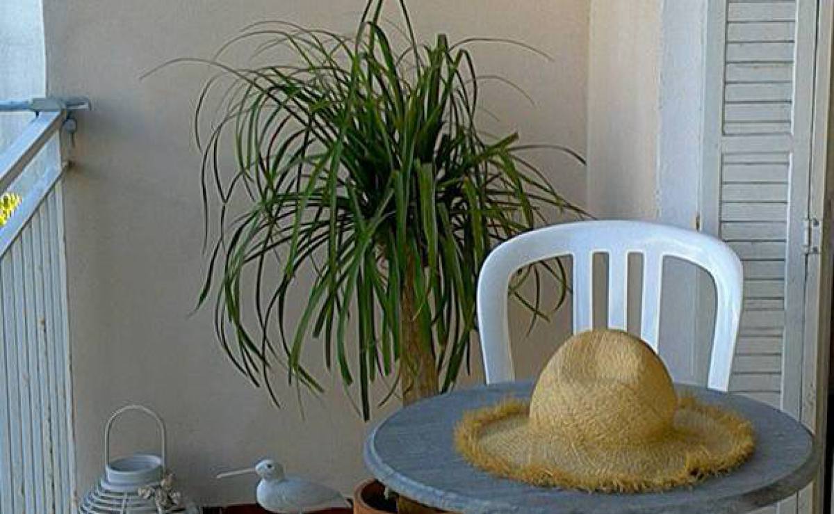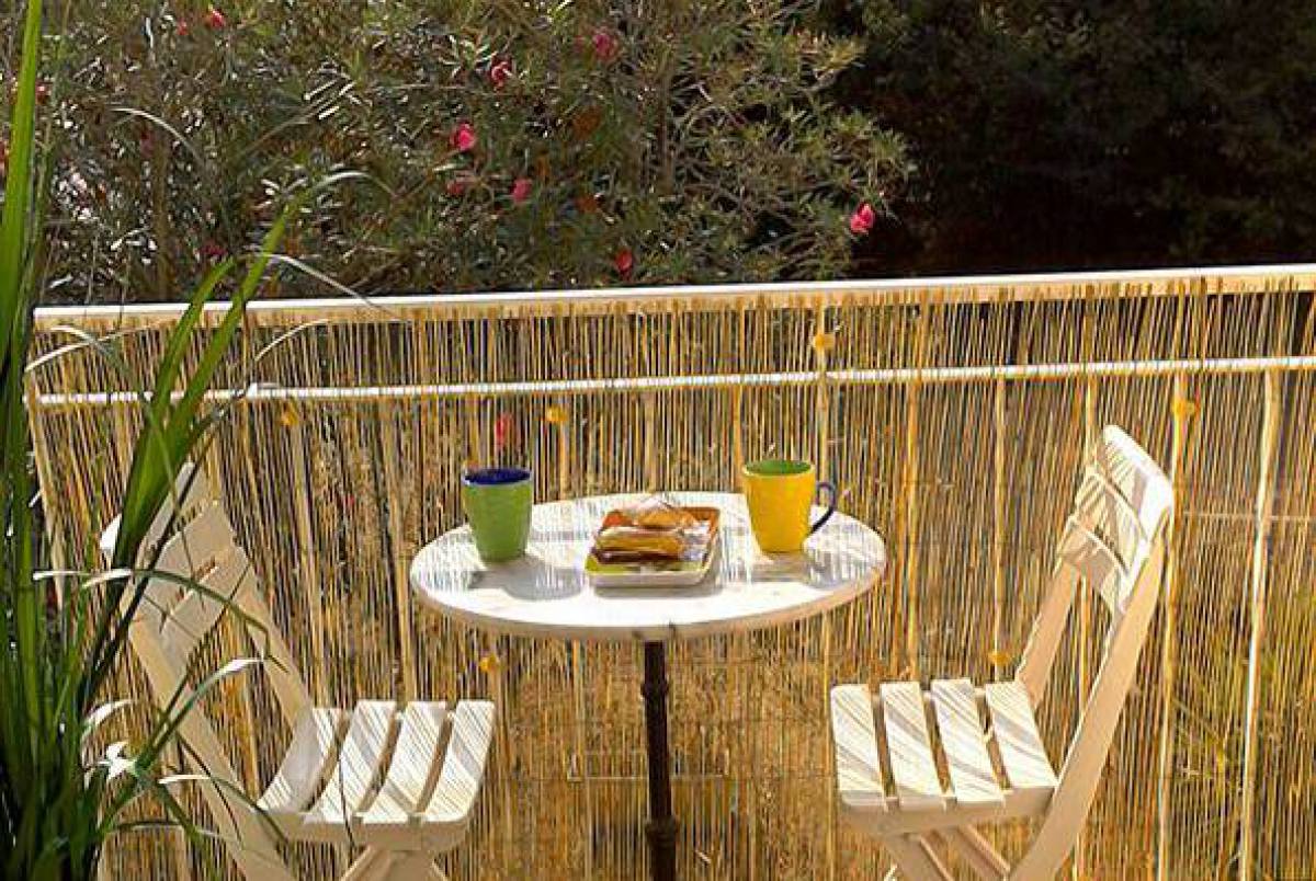 Le balcon ouest est côté jardin, la mer derrière les arbres. Balcon aménagé, pour prendre l'apéritif en amoureux à l'abri du beaucarnéa ou déjeuner sur la table bistrot, à l'ombre du grand parasol